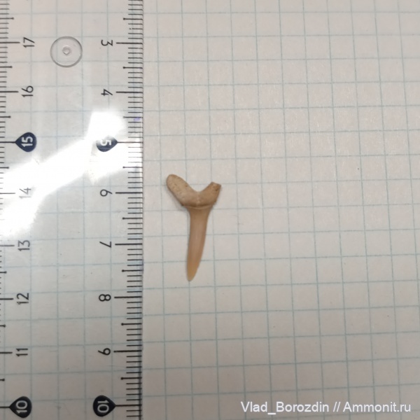 На фото небольшой зуб акулы Carcharias acutissima. Длина зуба примерно 2 см (если считать с корнем). Возраст находки Эоцен.