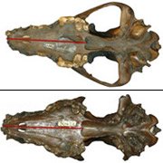 На фото: череп современного североамериканского волка (внизу), опасного хищника, кажется хрупким и изящным по сравнению с черепом древнего волка (вверху), изученного в новой работе (фото Blaire Van Valkenburgh). www.membrana.ru