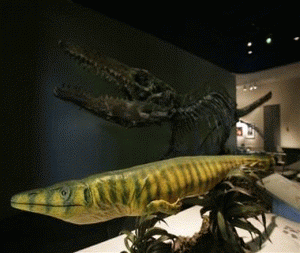 Смоделированный мозазавр выставлен в Далласском музее естественных наук. Ящер отличается острыми зубами и массивной челюстью, длина его тела составляет около одного метра.
