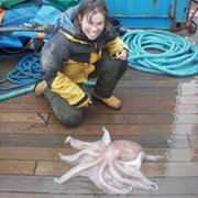 На фото: Джен Страгнелл и общий предок глубоководных осьминогов (фото с сайта zoo.cam.ac.uk). www.membrana.ru