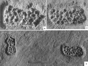 Скопления сферических и субсферических объектов были найдены в глинах кимериджского яруса верхней юры в Дорсете, в районе широко известного "юрского берега". Большинство этих скоплений были обнаружены в глине (возможно, когда-то они были закреплены на водорослях или каком-то ином субстрате), и они не были никаким образом связаны с аммонитами, но некоторые кладки были прикреплены к фрагментам жилых камер крупных раковин аммонитов рода Aulacostephanus.
