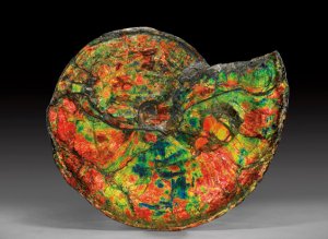 Еще один лот, ушедший с молотка за $50 000 - огромный, диаметром 50 сантиметров, аммонит, его раковина замещена опалом и переливается всеми цветами радуги. Этот аммонит относится к виду Placenticeras intercalare, он был найден в формации Бирпо (Bearpaw Formation) в провинции Альберта, Канада. Слои, в которых находят такие раковины, датируются верхним мелом.