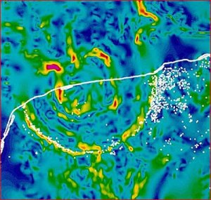 На иллюстрации: карта гравитационной аномалии в районе кратера Чиксулуб. Красным и желтым обозначены зоны высокой гравитации, зеленым и синим — низкой. Белая линия — это берег полуострова Юкатан. Белые точки — карстовые воронки.