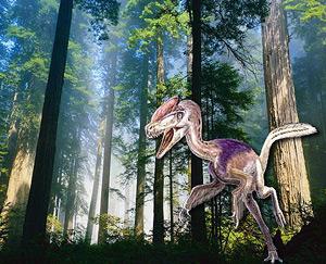 "Коронованный дракон" показывает все ключевые наследственные признаки тираннозавроидов: у него череп увеличенных размеров, снабженный саблевидными зубами "закоренелого" хищника, две мощные задние конечности и коротенькие, малополезные "ручки" (которые все же гораздо длиннее, чем у "рекса"). Более примитивные элементы скелета (в частности, его тазовая структура) свидетельствуют в пользу теории (выдвинутой еще в 1990-х гг.), согласно которой тираннозавроиды, несмотря на их крупные габариты, произошли от разновидности быстрых и мелких динозавров, называемых coelurosaurs, которые считаются также предшественниками современных птиц. Теперь полагают, что помимо всего прочего некоторые предки чешуйчатых монстров тираннозавров имели этакие нежные перышки. Подобные гипотезы бытовали в среде палеонтологов с того самого момента, как появились первые свидетельства существования динозавров с перьями при раскопках в Ляонине (северо-восток Китая) в 1995 году, и теперь вот эта новая находка все это тоже подтверждает ("оперением" явно снабжен и вышеприведенный рисованный монстр).