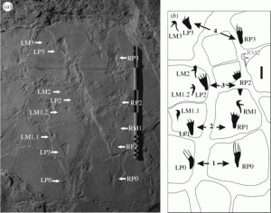 Изучение этих следов показало, что птерозавры садились на землю почти также, как это делают современные птицы. Небольшой птерозавр (длина его следов чуть меньше десяти сантиметров) коснулся поверхности грунта задними лапами, на мгновение оторвался от земли, прочертив длинные борозды когтями и снова приземлился, на этот раз окончательно, а затем опустился на все четыре конечности. К какому именно виду относился этот летающий ящер, сказать сложно, но ученые уверены, что это был птерозавр из группы птеродактилей.