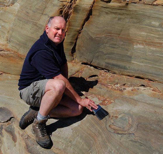 На фото – геолог Грег Браун, обнаруживший следы динозавров в Новой Зеландии, рядом с одним из этих следов. Фото с сайта GNS Science.
