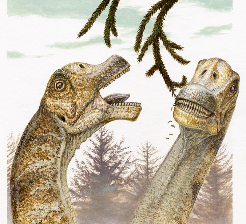 Автор Майкл Скрипник (Michael Skrepnick), рисунок с сайта Университета Бригама Янга. Здесь автор изобразил зауропод в "классическом" варианте, без хобота и на суше.
