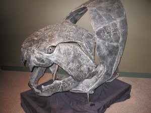 На фото - броня головы и передней части тела данклеостеуса (Dunkleosteus terrelli) - крупного хищника из класса плакодерм. Данклеостеус жил в позднем девоне и вымер в конце этого периода. Фото с сайта en.wikipedia.org