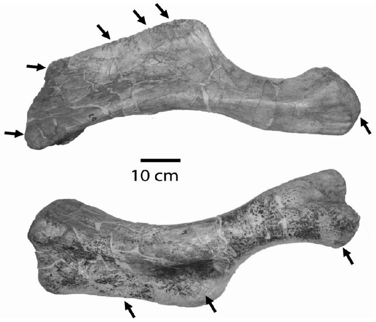 На фото - плечевая кость зауролофа (Saurolophus) с отпечатками зубов тарбозавра (Tarbosaurus). Следы укусов показаны стрелками. Фото из статьи в Acta Palaeontologica Polonica