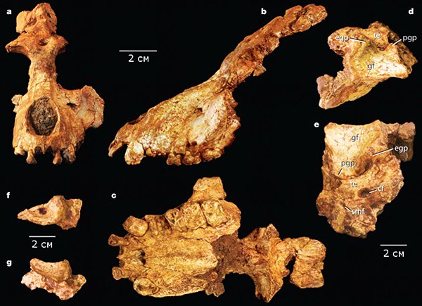 На фото - фрагменты черепа Saadanius hijazensis - вид спереди (а), сбоку (b) и снизу (с). Правая височная кость: вид спереди (d) и снизу (е). Затылочный мыщелок: f и g . Фото из пресс-релиза с сайта www.ns.umich.edu