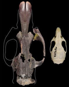 На фото - слева - череп ископаемой гигантской крысы Coryphomys musseri, а справа - череп современной обыкновенной черной крысы Rattus rattus длиной 3,5 см. Фото Ken Aplin, CSIRO с сайта www.membrana.ru.