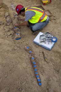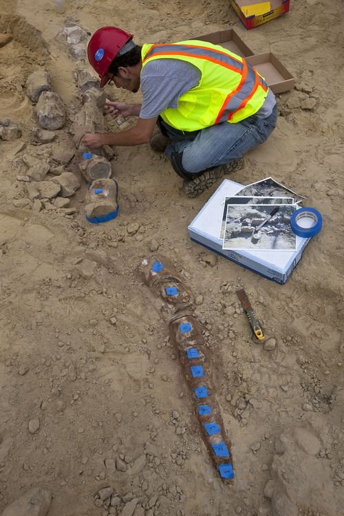 На фото - палеонтолог нумерует позвонки кита перед извлечение из породы. Фото с сайта San Diego Union-Tribune.
