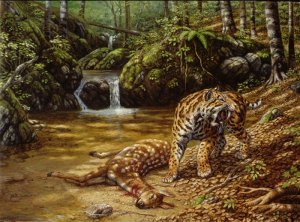 На иллюстрации - саблезубый хищник Мегантереон над своей добычей. Возможно, его раздражает присутствие неподалеку гоминид. Рисунок со страницы http://crazy-zoologist.livejournal.com/444534.html