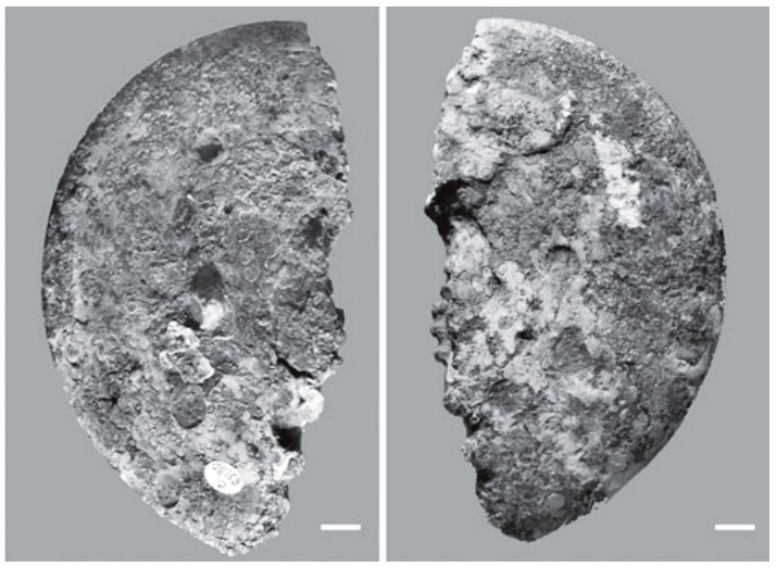 Авторы публикации обнаружили на фрагмоконах и жилых камерах этих аммонитов заполненные породой отверстия круглой, овальной или неправильной формы. Перегородки между камерами фрагмокона под такими отверстиями разрушены. Эти отверстия, несомненно, были на раковинах аммонитов до того, как те заполнились осадком. Но как они возникли?