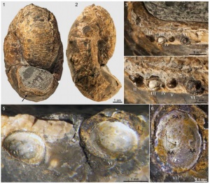 Фото из статьи Encrustation of inarticulate brachiopods on scaphitid ammonites and inoceramid bivalves from the Upper Cretaceous U. S. Western Interior.