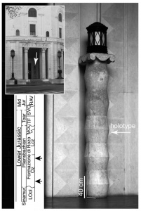 В прошлом году в журнале Historical Biology вышла статья, написанная коллективом палеонтологов из Италии, Германии и Японии. В ней был описан новый ихновид из плинсбаха Италии, относящийся к ихнороду Gastrochaenolites. Ихнофоссилии этого рода - это следы сверления, оставленные двустворчатыми моллюсками-камнеточцами в твердом субстрате: в камнях и раковинах. Сверления, относящиеся к Gastrochaenolites, встречаются, к примеру, на фосфатизированных ядрах аммонитов в зоне Panderi в Московском регионе. Новый вид Gastrochaenolites messisbugi, о котором идет речь в публикации, обнаружен в толстых стенках раковин двустворчатых моллюсков. То, что одни двустворки сверлили других (скорее всего, уже после их смерти) - дело довольно обычное. Необычно расположение голотипа (типового образца) нового вида: он находится в колонне у входа в центральное почтовое отделение города Феррара в Италии. Там же, в других частях колонны, находятся и паратипы нового вида. Авторы статьи утверждают, что возраст породы, использовавшейся для создания колонны у входа на почту можно определить с точностью до зоны (по бентосным фораминиферам). При этом, ни одного образца породы с новым типом сверлений нигде кроме как в этой колонне найти не удалось, поэтому и пришлось описывать новый вид со столь необычным расположением голотипа.
