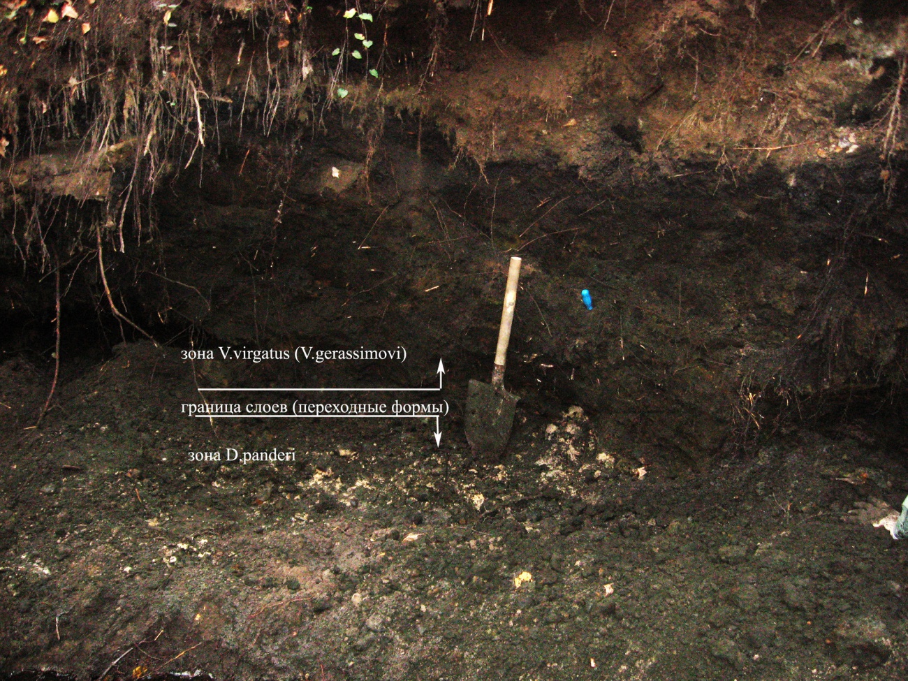 Зона V.virgatus, мощностью в среднем 60-90 см., представлена плотным, темным, песчанистым фосфоритом с редкими раковинами, довольно плохой сохранности: V.gerassimovi, V.pallasianus, Dorsoplanites sp., а так же редкими ядрами гастропод и двустворок. Ниже залегает тонкая прослойка темного, с прослойками рыжего цвкта, песчанистого фосфорита пограничного слоя с иногда встречающимися раковинами переходных видов Zaraiskites zarajskensis - Virgatites gerassimovi. мощность слоя 5-10 см. Еще ниже залегает твердый, спрессованный фосфатизированный песчаник зоны D.panderi изредка содержащий сильно давленные или деформированные раковины ископаемых: Zaraiskites sp., двустворок. Видимая толщина слоя 10-15 см., ниже слой сильно обводнен.