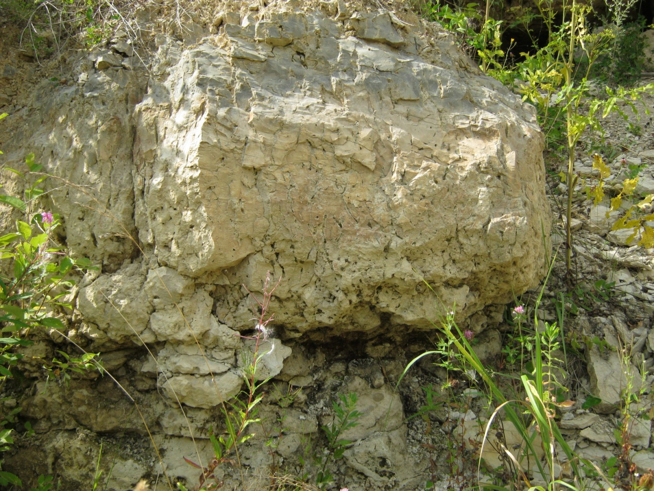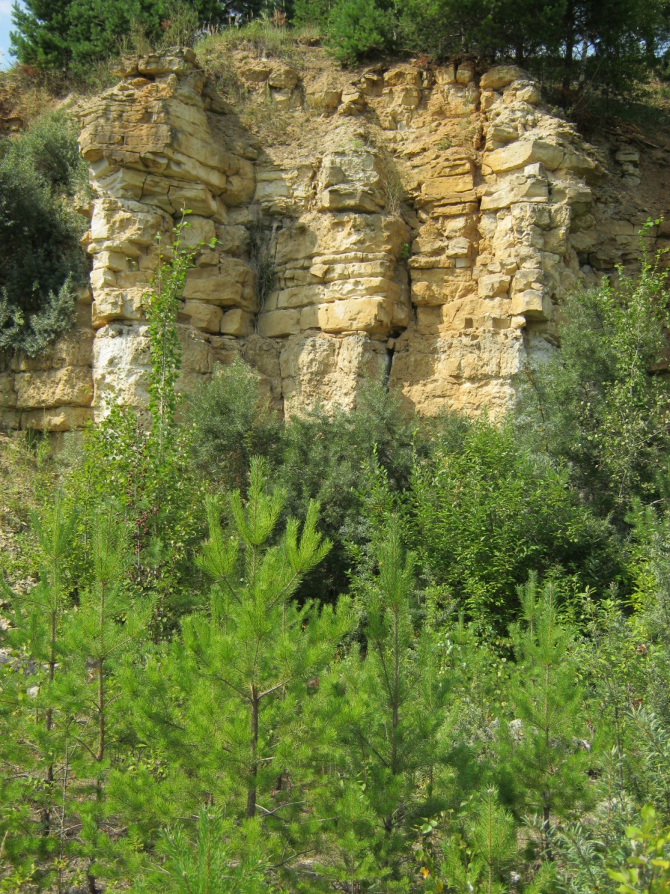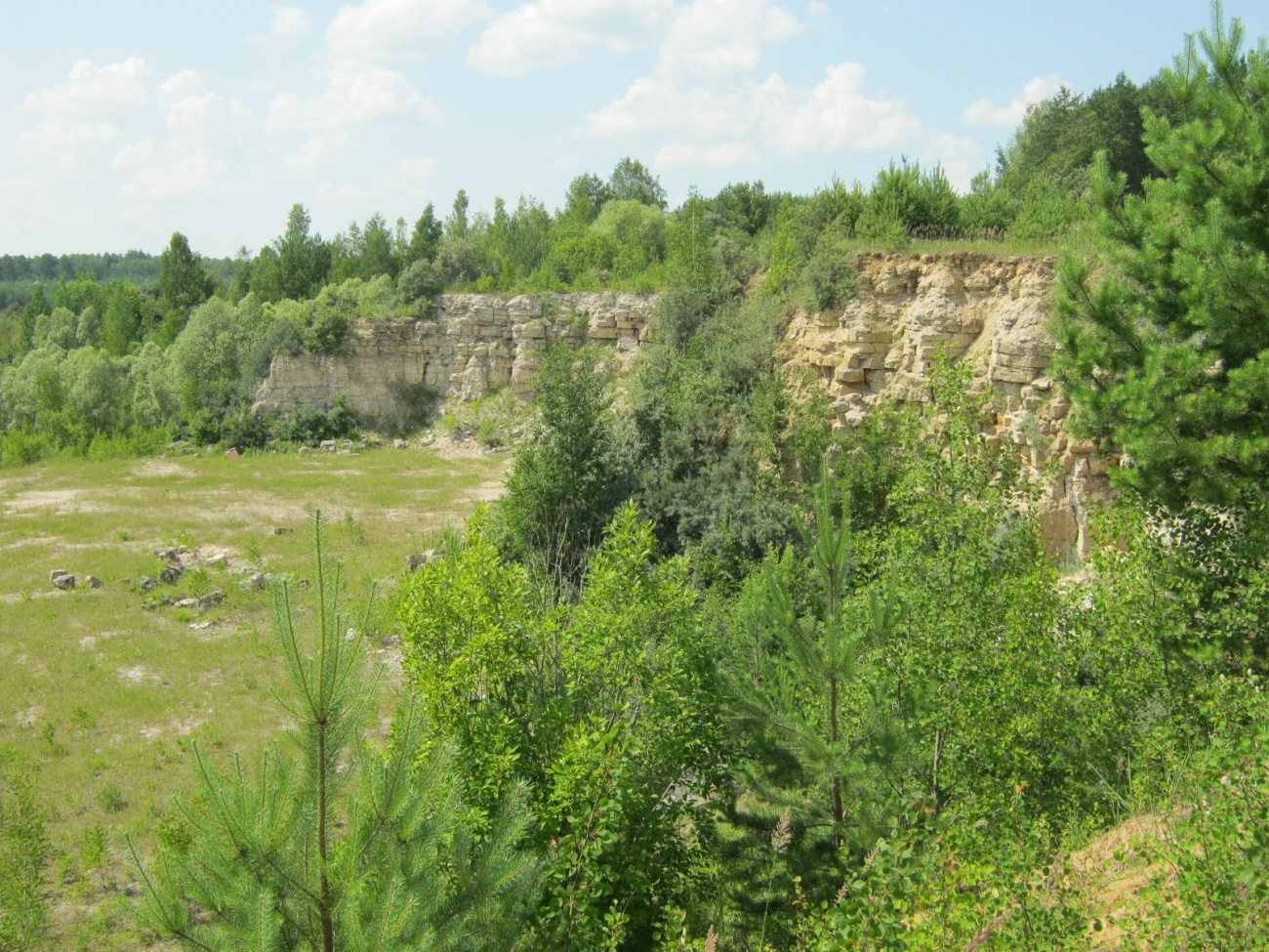 Вскрыты известняки низа серпуховского яруса(тарусский горизонт) и верх визейского яруса(веневский горизонт).Визитная карточка карьера микрозернистые почти чёрные ризоидные известняки в кровле веневского горизонта.На фото фрагмент ризоидных и интракластовых известняков веневского горизонта.Собственно сам известковый карьер состоит из нескольких стенок.Первая обнажает верх тарусского горизонта.Вторая, самая протяжённая, низ тарусского и верх веневского горизонтов,граница между ними хорошо видна в центральной части разреза(слой ризоидных известняков серого цвета мощностью 40-50 см).И последняя стенка,всего 2-2,5 метра,низ веневского горизонта.Подтверждения тому что был частично вскрыт михайловский горизонт или хотя бы его кровля я не обнаружил.Карьер довольно беден,встречаются различные кораллы,брахиоподы,гастроподы,хететесы.