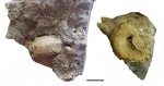 Вверху обнажения прослой сильно выветрелого серого алевролита мощностью ~40 см, переполненный члениками криноидей, ядрами брахиопод и отпечатками и ядрами гастропод родов Bellerophon и Pleurotomaria.