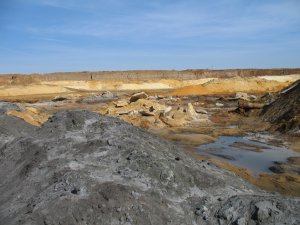 Юрские отложения в этом карьере представлены фосфоритами, глинами и песками. Сверху все это перекрыто толщей меловых (а возможно, и частично юрских) песков, которые там собственно и добывают. Под песками располагается слой черных глин и прочная фосфоритовая плита, относящаяся к зоне Craspedites subditus/ Garniericeras catenulatum. Именно в этой плите встречаются перламутровые раковины аммониты родов Garniericeras и Craspedites хорошей сохранности, многочисленные двустворки Pleuromya, Entolium, Buchia, и другие, брахиоподы Russiella и Rhynchonella, гастроподы и ростры белемнитов. Ростры белемнитов, впрочем, там очень часто растворенные, от них остаются лишь отверстия в камне.