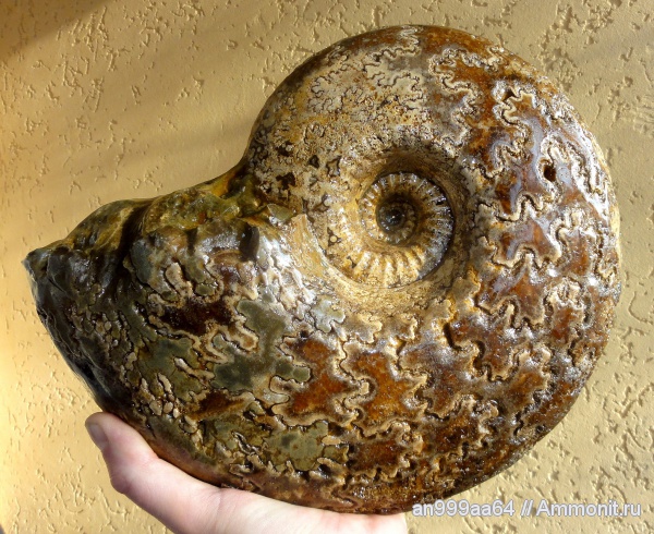 еще один "малыш" полученный благодаря Уважаемому Омару, мах размер около 30 см., вес почти 10 кг., внешняя оболочка раковины не сохранилась осталось только почти целиком кальцитовое ядро, очищен, отшлифован, покрыт лаком, Parahoplites sp.