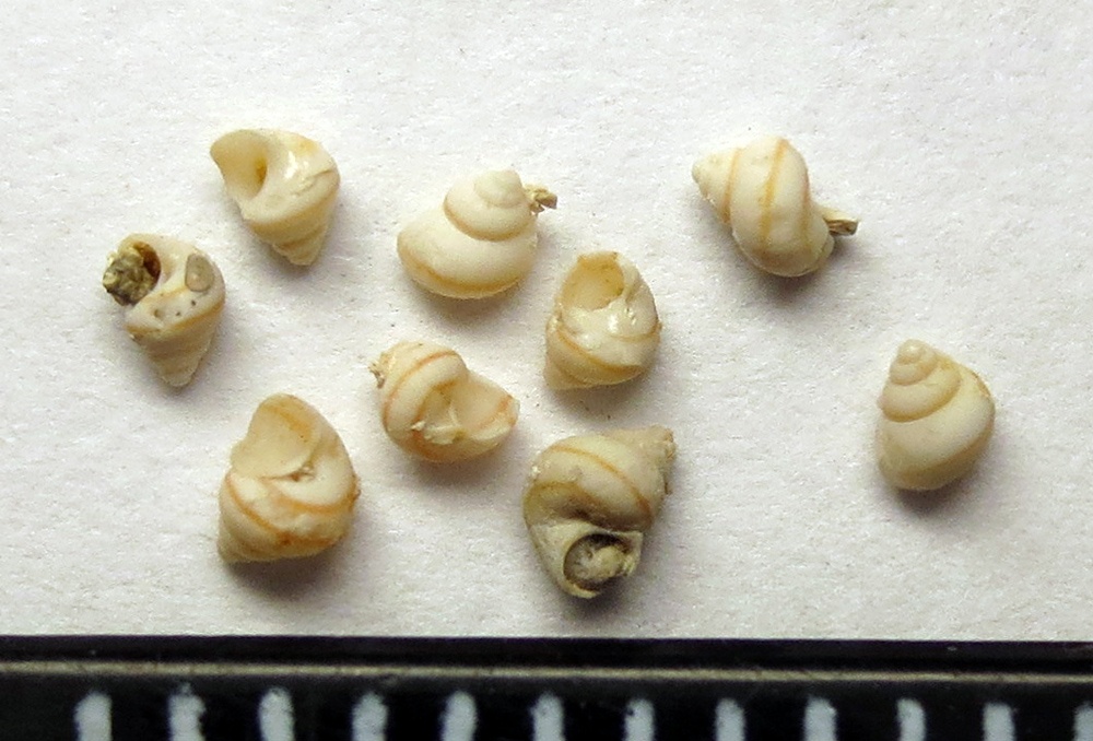 Ещё одна раковина с прижизненым узором в виде оранжевой полосы по килю последнего оборота Edrozeba zonata, Hydrobiidae из сарматских отложений.