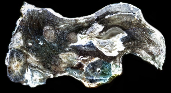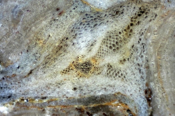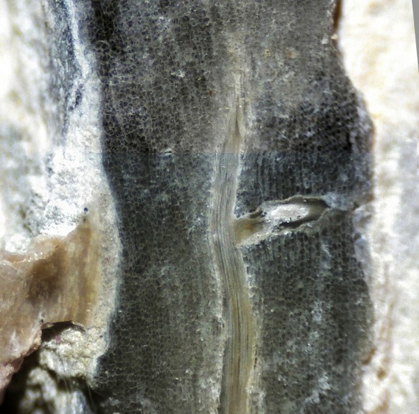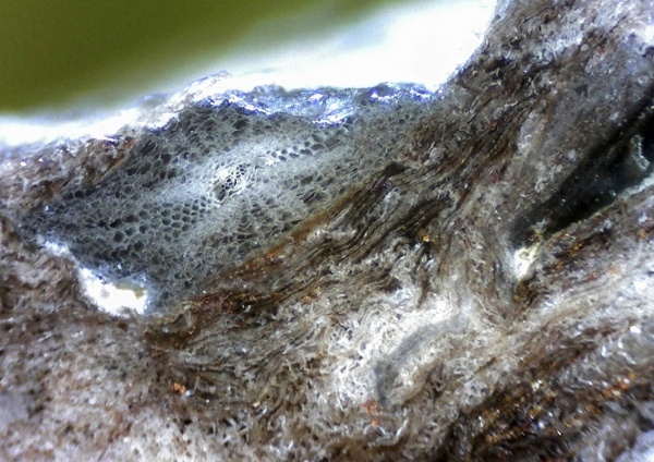 К своему большому удивлению после пришлифовки я не обнаружил типичной "деревянной"структуры с сердцевиной, рядами трахеид и т.д. Вместо этого даже без микроскопа стали просматриваться отдельные "стволики" как снаружи, так и внутри cобственно ствола.
