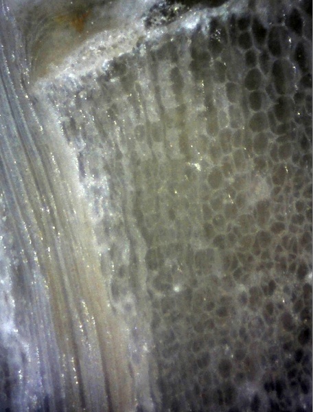 И вот недавно дошло дело до детального осмотра (в первую очередь клеточной структуры), что стало возможным после полировки торца одного из фрагментов.