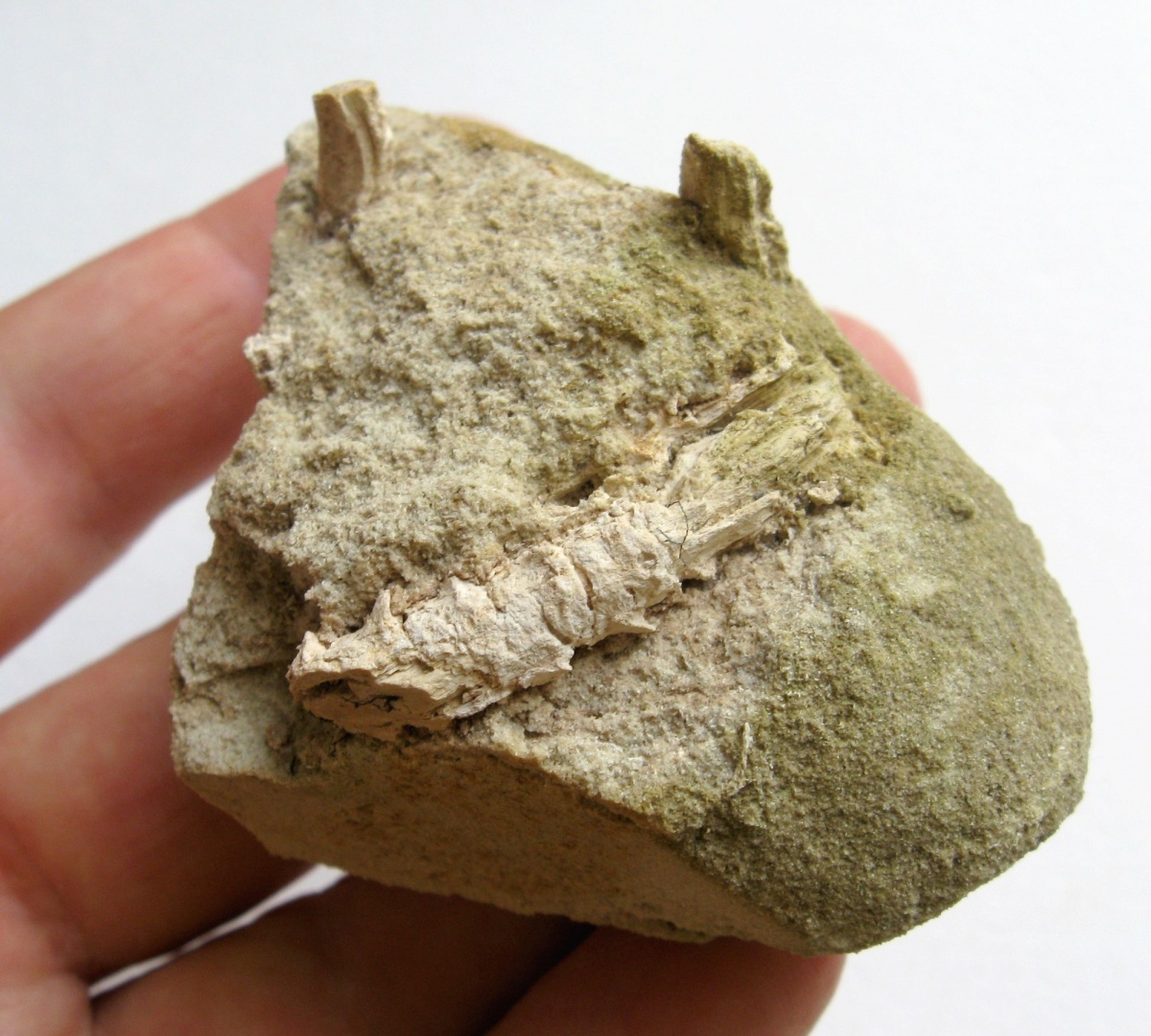 Рядом с фрагментом хвойной веточки (диаметр 1 см) видны как минимум четыре стебля (стрелки), находящиеся в вертикальном положении (in situ) диаметром 2-3 мм.
