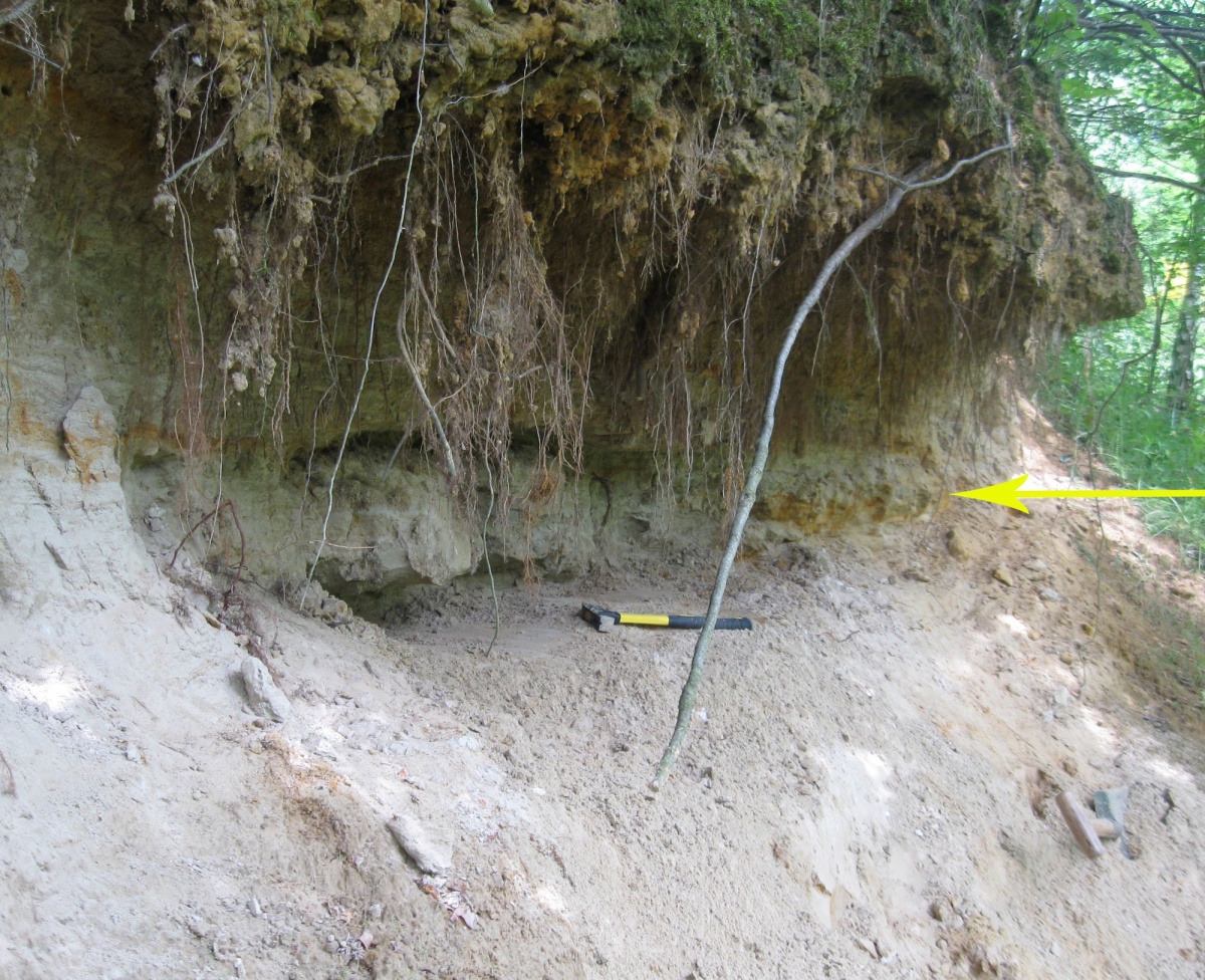 Стрелкой показан пласт с конкрециями и линзами песчаника со стеблями в прижизненном положении и фрагментами сухопутных растений, принесенных извне.