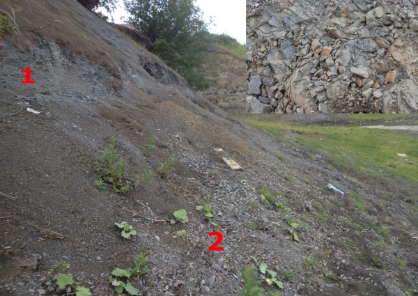 А на самом осыпном склоне (1) ростры представлены другой породой (что-то вроде мела) и в гораздо худшем состоянии.