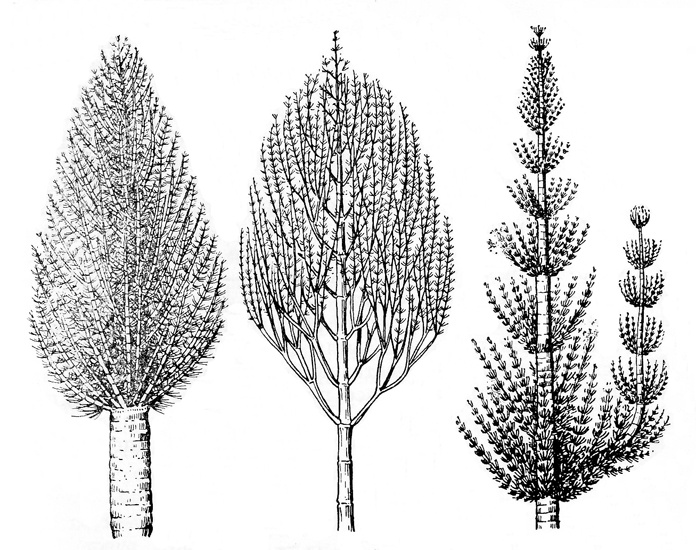 Появились в самом верху девона, исчезли в перми. Это были не большие ( до 1 м. ), травянистые растения ведшие полупогружённый в воду образ жизни. Немецкие коллеги против этого категорически возражают, аргументируя это наличием вторичной древесины на старых стволиках которая погружённому растению не к чему, у современных растений обитающих в воде этого нет.