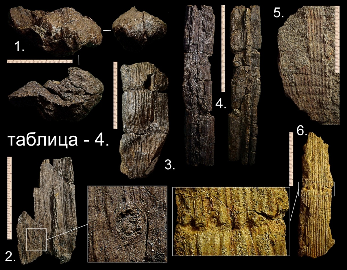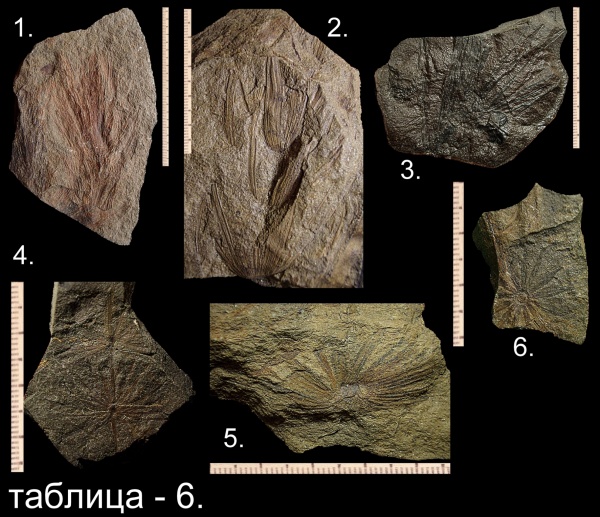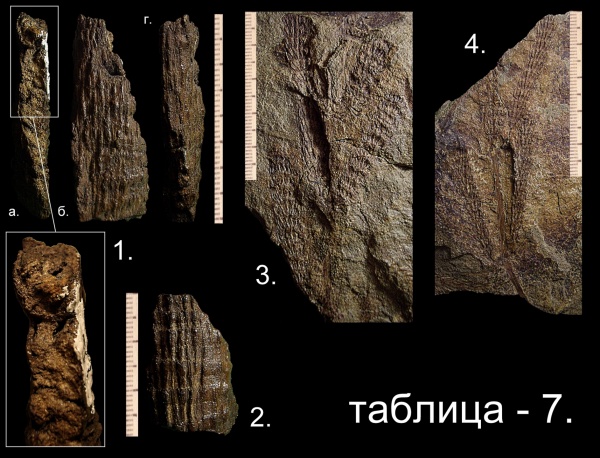 фиг.4;5;6 - Sphenophyllum sp., стебли, фиг.6 - ствол, прикорневая часть.