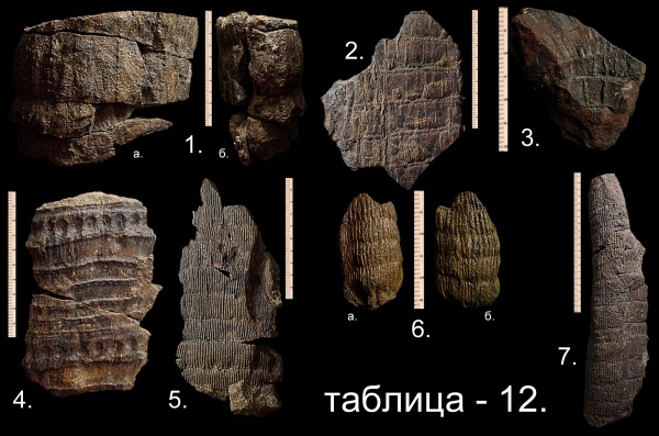 Таблица - 1. Реконструкции каламитов ( узлы с веточными рубцами ). Сверху в низ.