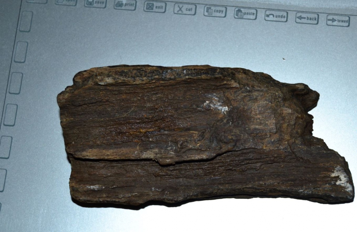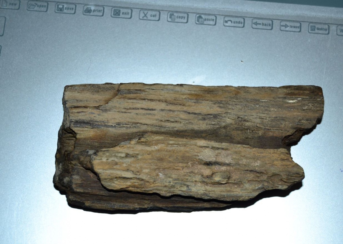 В детстве друг показывал якобы окаменелое дерево найденное его отцом.Точное местонахождение находки естественно было не известно, а образец за многие годы утерян. В принципе на поиски подобного я и отправился. Возращаясь назад, на дне оврага в тине под водой увидел стоящий на ребре осколок. На фото он как есть сырой еще.