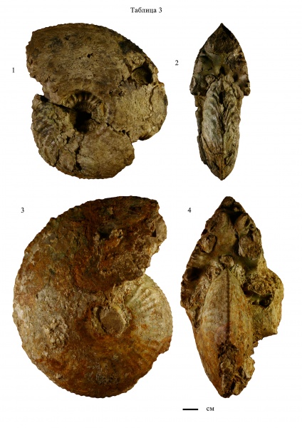 Фиг. 3, 4. Cardioceras (Scoticardioceras) ex. gr. tolli (Pavl.). Костромская область р. Сендега. Средний оксфорд. Зона Cardioceras tenuiserratum.