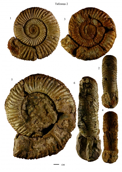 Фиг. 1-6,. Perisphinctes (Kranaosphinctes) ex. gr. bolobanowi (Nik.). Костромская область р. Сендега. Средний оксфорд. Зона Vertebriceras densiplicatum.