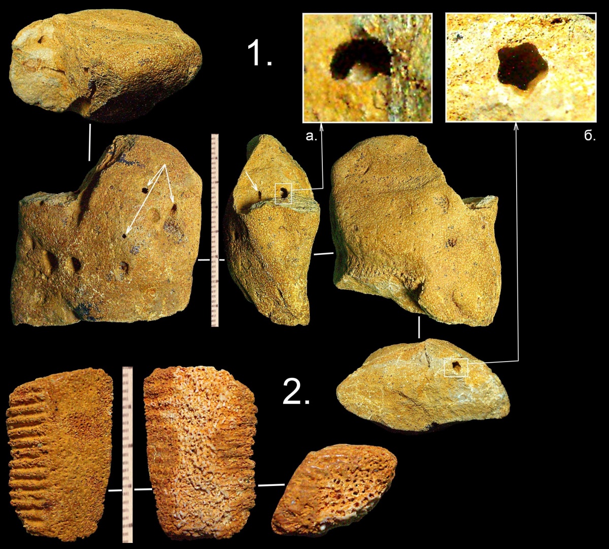 фиг.1 - фрагмент крупного копролита предположительно ската рода Myliobatidae он весь буквально "нашпигован" полостями от растворившихся игл морских ежей, указаны стрелочками, на врезках крупно поперечное сечение.