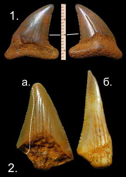 фиг.1 - Otodus sp. как мне кажется прослеживается мелкий вид, у меня уже такой, близкий по форме и размеру, пятый зуб с пильчатостью.