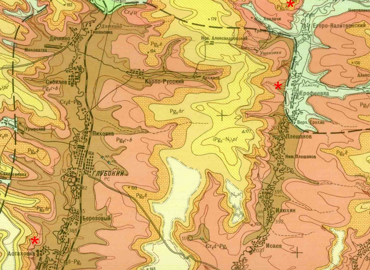 Геологическая карта района поисков. Красными звёздочками отмечены места находок флоры и фауны палеогена.