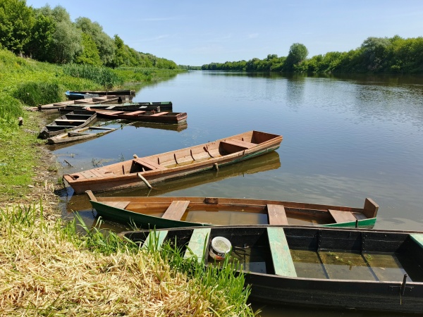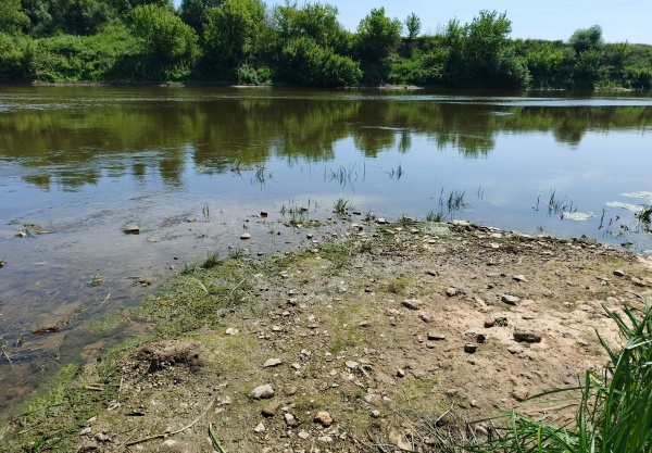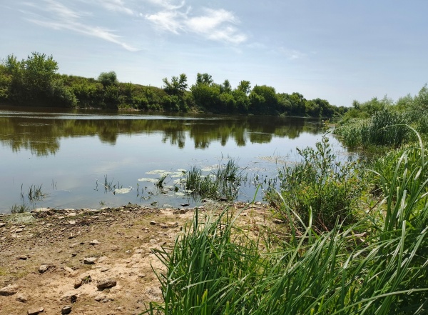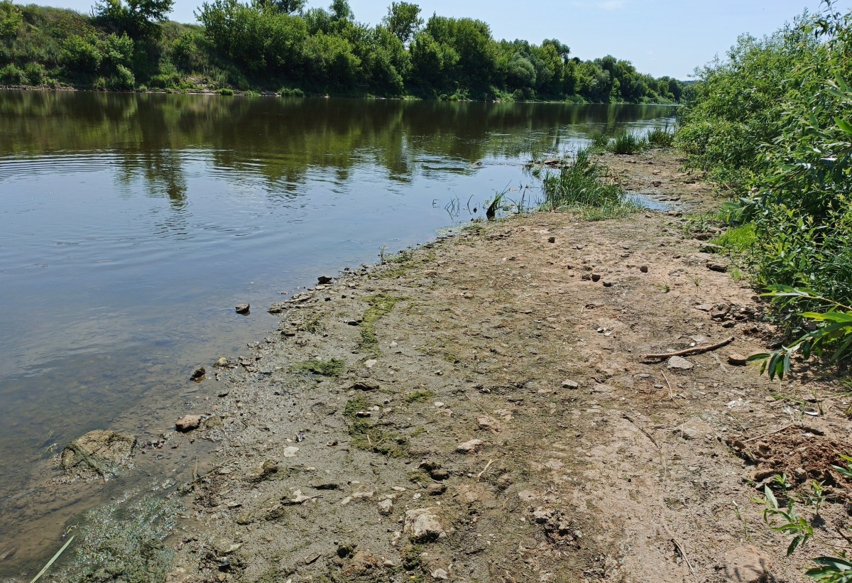 Всё заилено,так как не было половодья.Вода ещё стоит высоко,и не видно обрывистого берега серо-голубой глины с прослойками известняка с брахиоподами.На мелководье и берегу торчат девонские камни,обросшие водорослями и чёрным скользким слоем бактерий.Берега утопают в зелени,кишащей мелкой живностью : лягушками,змеями,ящерицами,насекомыми. На быстрине жерех гоняет малька. А были годы,когда льды во время ледохода сбривали все кусты и многолетние деревца,снимали слой земли и ила до девонских камней,но, увы,это было давно.