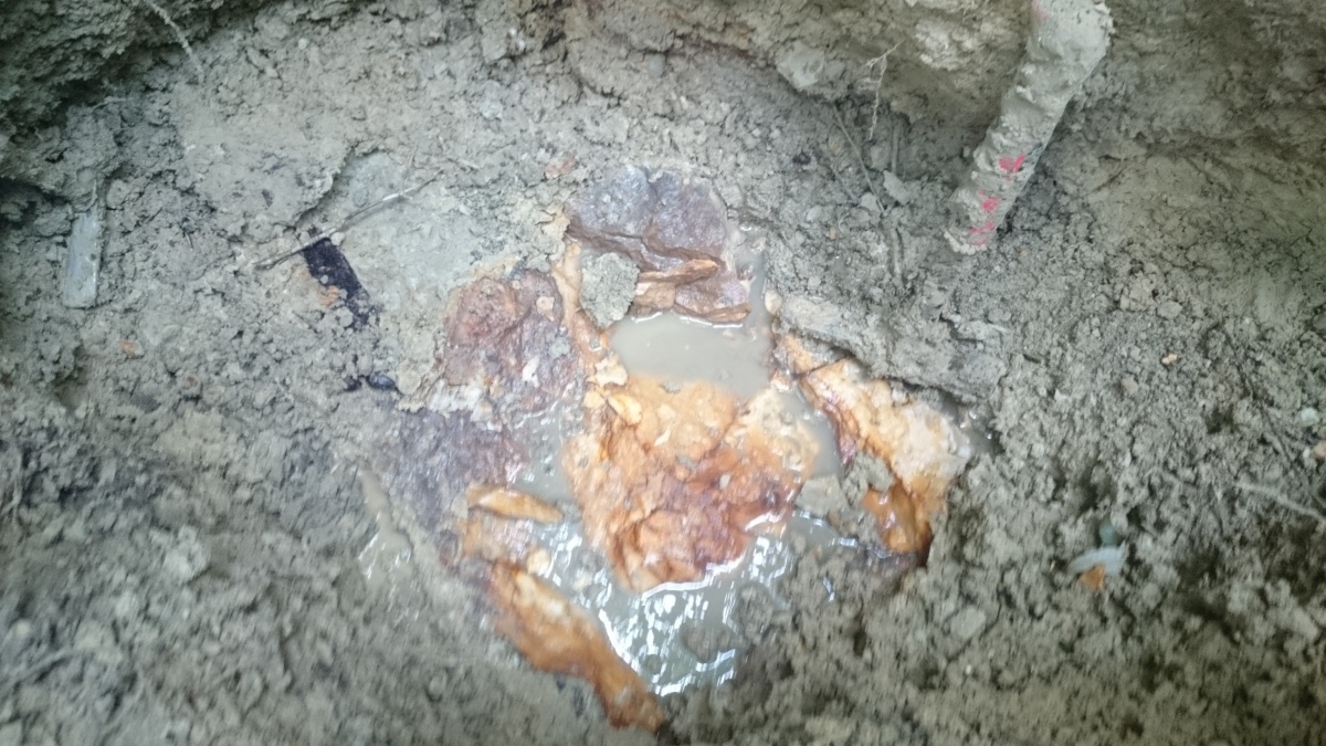 Малая часть Alveolites, сколько уходит вглубь никому неизвестно) Справа молоток для масштаба.