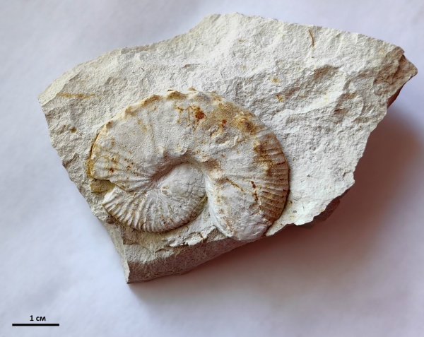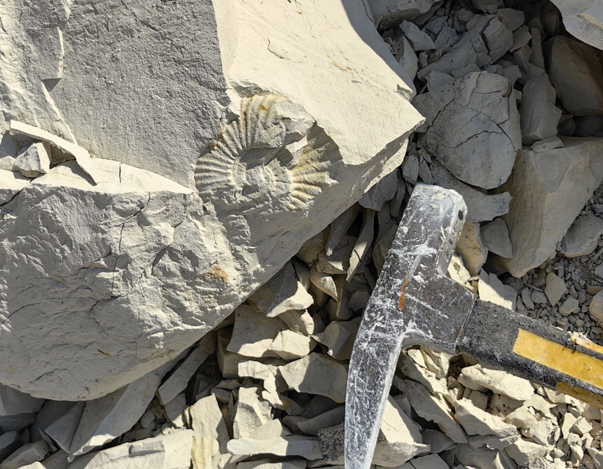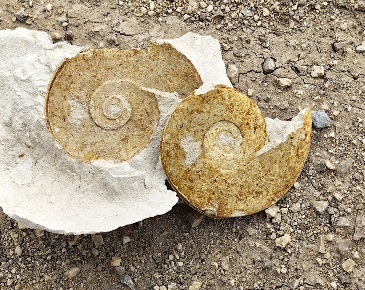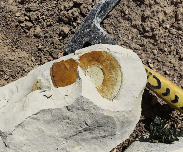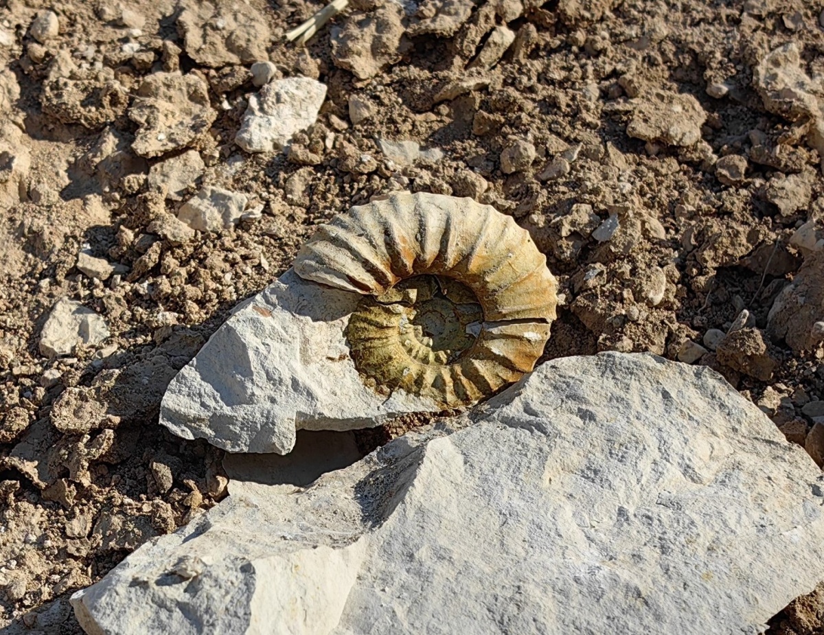 В этих осадочных породах мы нашли несколько ядер дисковидных аммонитов Hauericeras с сохранившимися килями. Один - толщиной до 10 мм.