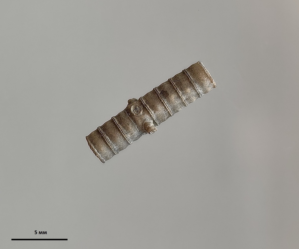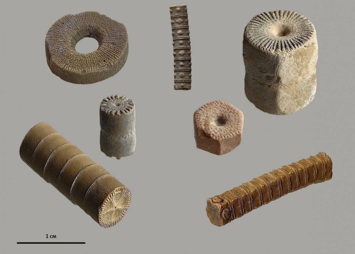 Среди фрагментов скелетов морских лилий доминируют стебли морских лилий Balanocrinus с круглым и пятилопастным сечениями. Реже – крупные «колесики» и столбики стеблей Apiocrinus. Еще реже фрагменты циртокринид. Стебельки отличной сохранности, с хорошо сохранившимся рисунком сочленовной поверхности. Нашли и прикрепительные диски , и чашечки лилий.
