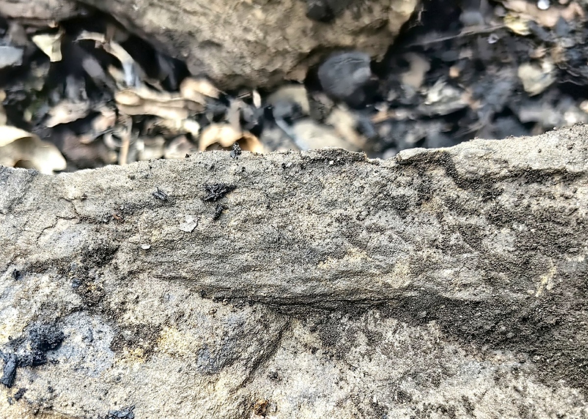 Полез проверять, в бурелом, нашёл уголёк. Сам уголь безнадёжно выветрелый в пыль, а вот в подошве песчаника открылся переслой угля и песчаника. Новая точка по добыче «накомодников». Наковырял, как выяснилось позже, приличный 3d каламит.
