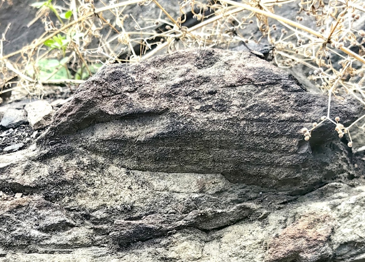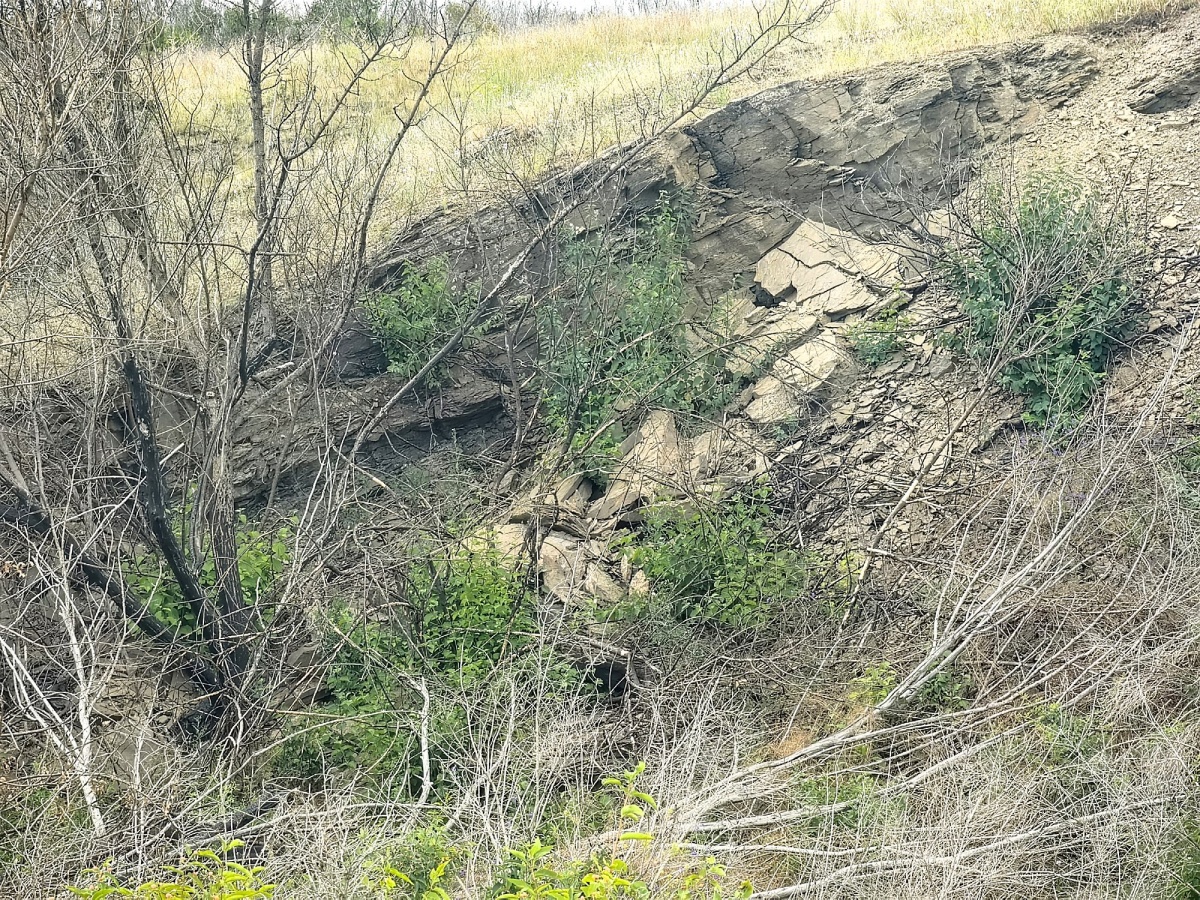 И вот по этой балке я решил пройтись, не был лет сорок в этом краю. И протопав чуть больше километра наткнулся на уступ, выход песчаника, а в свите С2/4 песчаники интересные, очень часто либо на них, либо под ними залегают угли.