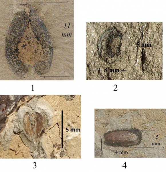 Описание. Семена плоские, эллиптического или чечевицеобразного сечения, по очертанию округлые, слегка вдавленные при основании, на верхушке заостренные, на поверхности тонкобороздчатые и с рельефными эллиптическими следами, соответствующими структуре скорлупы. (Таблица 15 Фиг. 3)