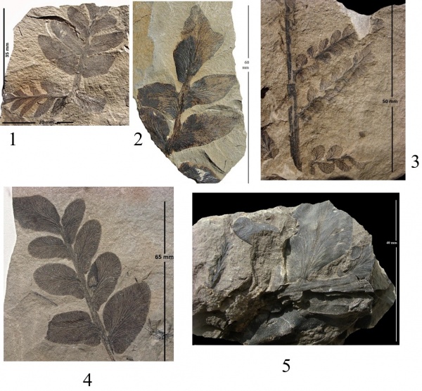 Описание. Листья, достигающие- большой величины, трижды- или четыреждыперистые с вильчаторазделенным главным стержнем с односторонними перистыми ветвями. Перышки пекоптероидные и невроптероидные, прикреплены к стержням широким основанием. Средняя жилка незаметная. Вторичные жилки возникают от средней жилки перышка и от его стержня: они одинаковые, вильчато делятся под острым углом и веерообразно расходятся по пластинке перышка. Базальное нижнее перышко каждого пера обычно двулопастное или многолопастное расположено в нижнем углу, образуемым пером и главным стержнем, и прикреплено одновременно как к последнему, так и к вторичному стержню пера.