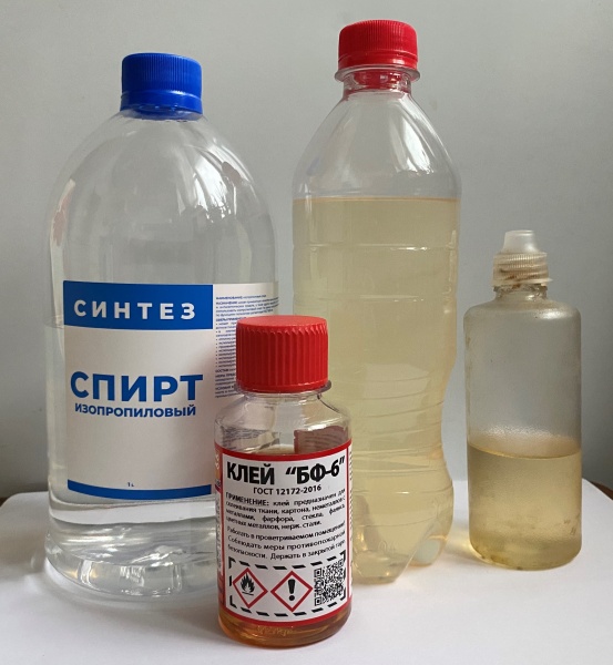 Впрочем, каких-то принципиальных отличий лично я не заметил. Мне довелось пользоваться раствором ПВБ, потом использовал медицинский БФ-6, разводя его медицинским же, 95% этиловым спиртом. В конечном итоге, остановился на техническом БФ-6 и изопропиловом спирте, которые легко купить на маркетплейсах.