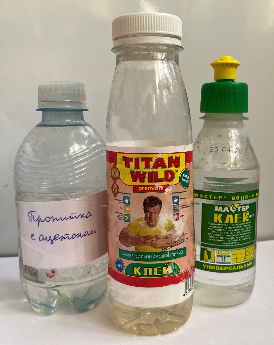 Для пропитки используют спиртовые и ацетоновые растворы клея «Титан». Причем, разные концентрации можно использовать и для склейки (более густые), и для пропитки (сильно разведенные). В качестве растворителя, мне больше нравится ацетон. Но следует помнить, что с ацетоном не рекомендуется работать в закрытом помещении!